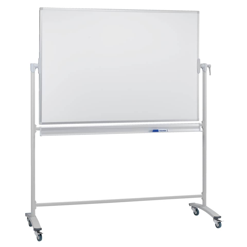 Die lackierte Oberfläche ist magnethaftend, trocken und nass abwischbar, sowie beidseitig beschriftbar. Mit integrierter Ablageleiste und vier Doppellenkrollen (davon zwei feststellbar). Das Gestell und der Rahmen sind aus weißem Metall. Die horizontale Drehachse ist um 360° schwenkbar und stufenlos arretierbar.