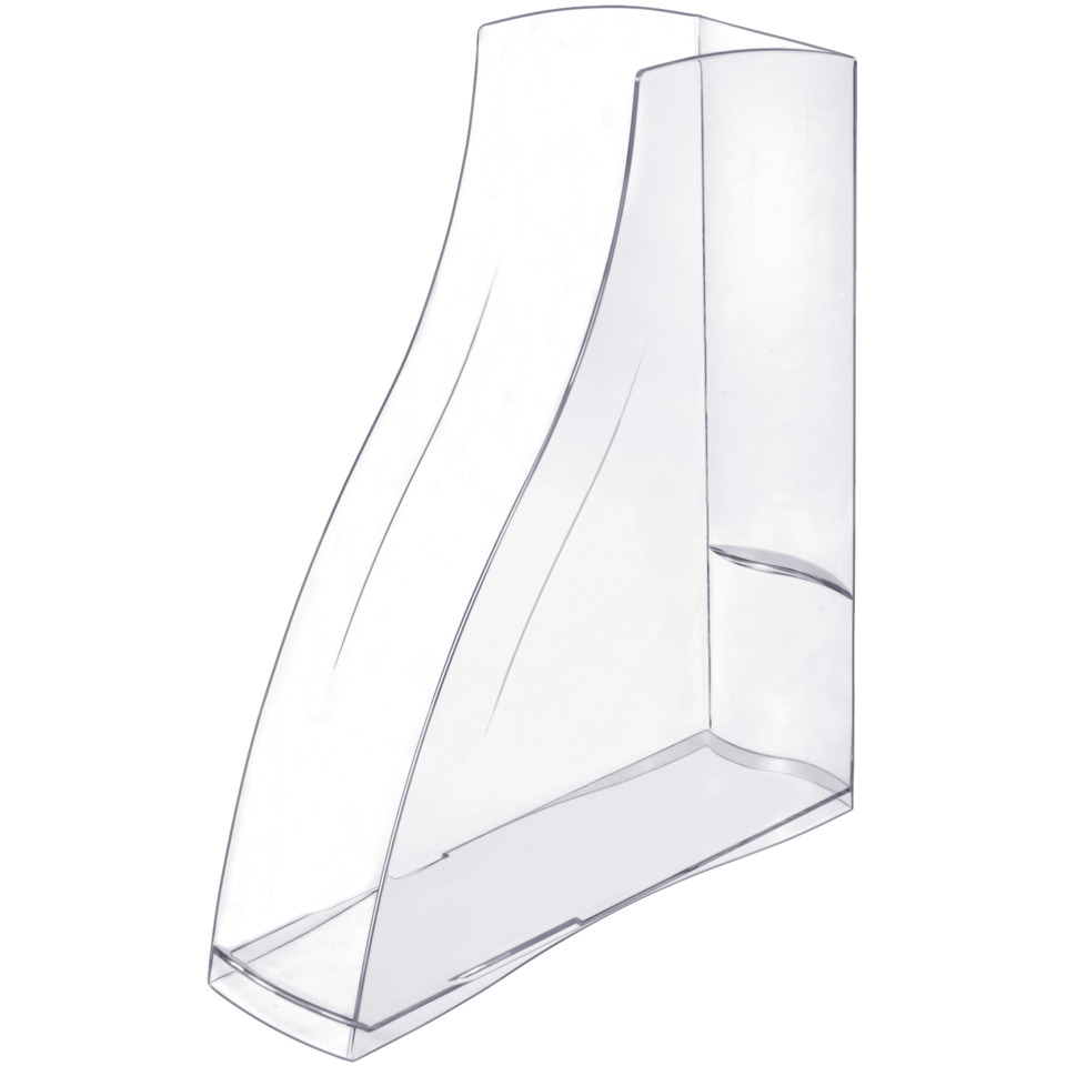 Formschöner Stehsammler aus Polystyrol in innovativem und eleganten Design mit ausgefallenen Kanten in S-Form. Greifrille für leichtes Herausziehen aus dem Regal. Robustes hochglänzendes Material. Für Formate bis 240 x 320 mm. Größe: (B x H x T) 83 x 325 x 278 mm.