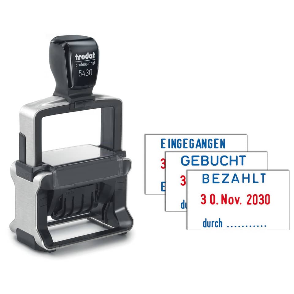 Selbstfärbender Datumstempel 5430/L · Stempeltext austauschbar, Sichtfenster vorhanden, Stempelkissen austauschbar · Beispiel für Datumanzeige: 17. März 2010 · robust mit Stahlkern, kann individuell mit den beiliegenden Texten versehen werden · Material und Farbe: Stahl-Kunststoff, dunkelgrau-grau-rot · Stempeltext: EINGEGANGEN / BEZAHLT / GEBUCHT + Datum · Stempelfläche: 41 x 24 mm · Schrifthöhe: 4 mm · Stempelfarbe: blau-rot