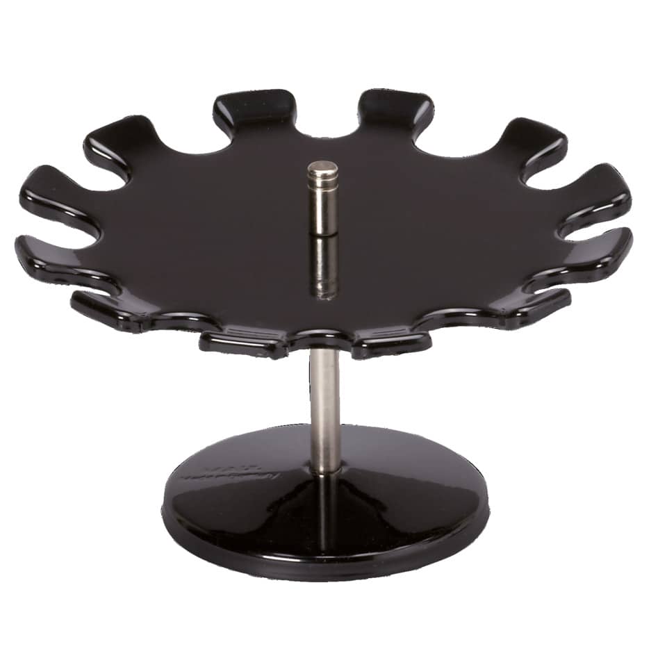 Stempelträger in runder Ausführung. Form: rund. Anzahl der Etagen: 1 Etage. Drehbar. Material: metall, pulverbeschichtet. Fuß Ø 85 mm Tellerrand leicht nach oben gebogen: Stempel fallen beim Drehen nicht heraus. Sehr stabil und standfest. Kratzfest und unempfindlich. Säule und Griff vernickelt. Anzahl der Stempel: 12 Stempel. Größe (B x H x T): 160 x 100 x 160 mm. Farbe: schwarz.