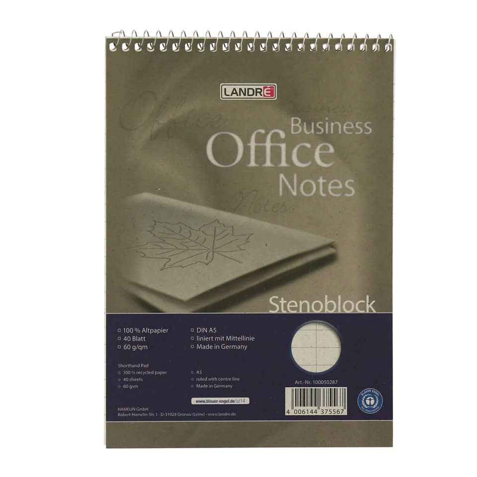 Stenoblock RCP. Bindung (Art): Kopfspirale. Ungelocht. Recycling 60 g/qm. Farbe: silber. Format: A5. Lineatur: liniert mit roter Mittellinie. Blatt: 40. (Hersteller-Artikelnummer alt: 367504012).