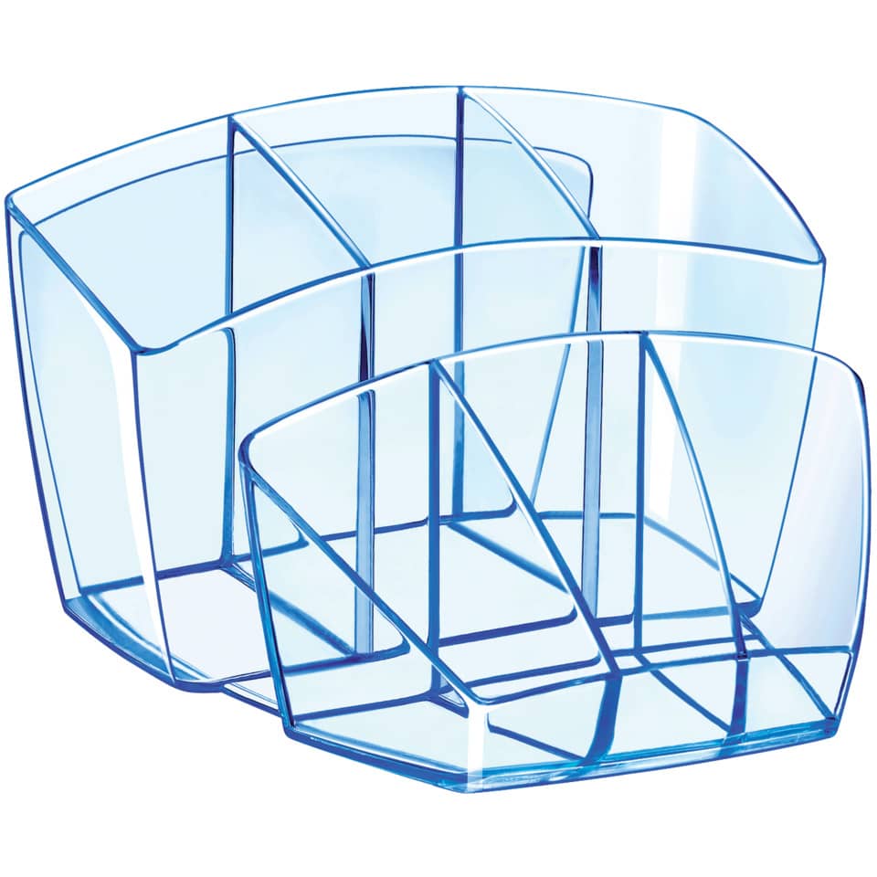 Dieser clevere und moderne Multiköcher ergänzt Ihre Ice Blue Schreibtischgarnitur. Transparent mit eisblauleuchtenden Kanten, die die eleganten Linien unterstreichen. Er schafft Ordnung auf Ihrem Schreibtisch und sichert das funktionelle Aufbewahren Ihrer Schreibgeräte. Kapazität : 40 Stifte, 5 Textmarker, 2 CD-Rom + 3 Fächer für das Durcheinander. Maße : 14,3 x 15,8 H 9,3 cm. Material: robustes und hochglänzendes Polystyrol.