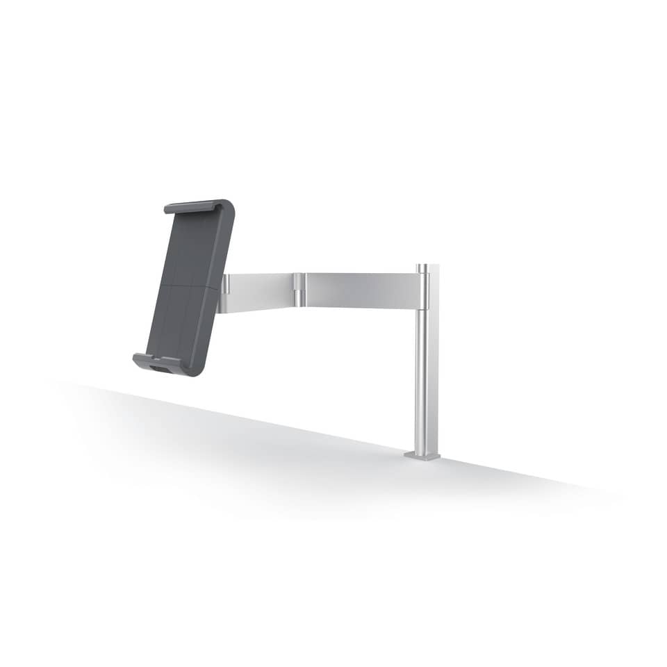 Tablet Halter HOLDER TABLE CLAMP. Werkstoff: Aluminium, ABS. Mit beweglichem Tragarm, variables Aufnahmemodul für alle Tablet Größen von 7″-13″, 360° drehbar für Hoch- und Querformat, mit Rastpunkten bei jeweils 90°, Neigebereich Halter: -6° bis +46°. Höhe Tischsäule: 295 mm, für bis zu 40 mm Tischplattenstärke. Tragarm Ausladung: 365 mm, Drehbarkeit: 180°. Größe (B x H x T): 100 x 440 x 210 mm. Farbe: metallic silber.