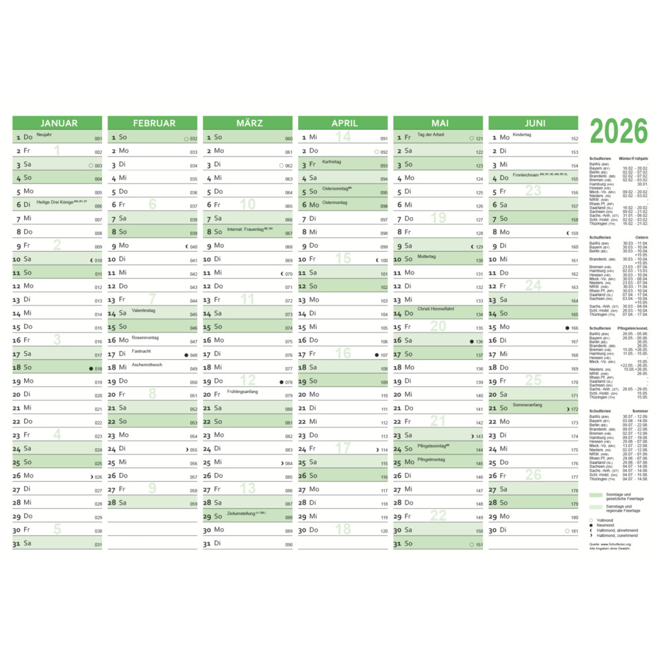 Tafelkalender 2026, DIN A5 quer, 250g/m² Karton, Ausführung der Kalenderaufteilung: 6 Monate je auf Vorder- und Rückseite, Anzahl der Seiten: 1 1, mit allen Ferienterminen, Größe (B x H): 210 mm, 148 mm, Ausführung der Bindung: keine, Arbeitstagezählung vorhanden, Wochenzählung vorhanden, Ausführung der Sprachauswahl: Deutsch, Ausführung Einband: kein Einband, kein Einband.