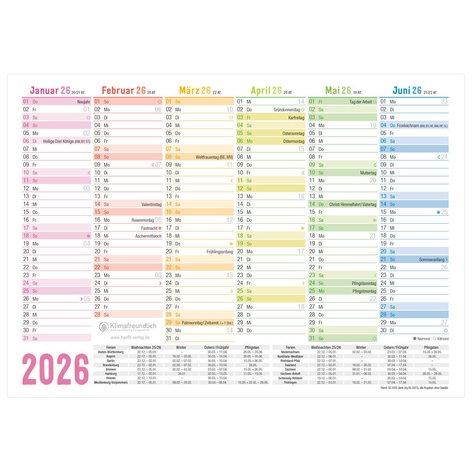 Beidseitig zu benutzender A4-Tafelkalender, Laufzeit Januar bis Dezember 2026, 6 Monate pro Seite, hochwertiger, robuster Karton, Grammatur 400 g/m², mit praktischem Aufhängeloch