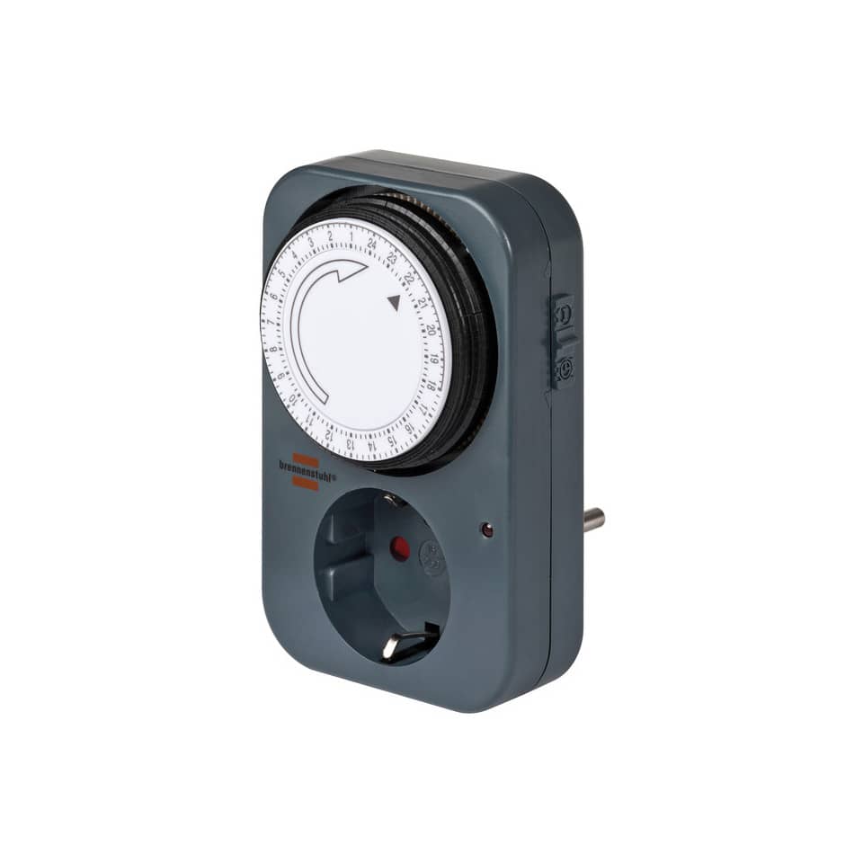 Die mechanische Zeitschaltuhr von Brennenstuhl in der Farbe grau besticht durch ihre Qualität und Sicherheit in allen Bereichen. Sie verfügt nicht nur über einen erhöhten Berührungsschutz, sondern besticht außerdem durch folgende Eigenschaften: Tageszeitschaltuhr mit 24 Stunden-Programm. 96 Ein-/Ausschaltzeiten pro Tag. Minimaler Schaltabstand: 15 Minuten. Mit LED-Funktionsanzeige. Sehr einfache Bedienung. Steckdose mit erhöhtem Berührungsschutz. Nennspannung: 230 V. Nennstrom: 16 A. Stecksystem DE.