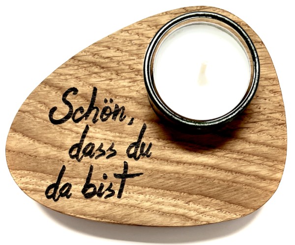 Teelicht Halterung aus Eiche 12 x 9,5cm geölt & graviert „Schön dass du da bist“