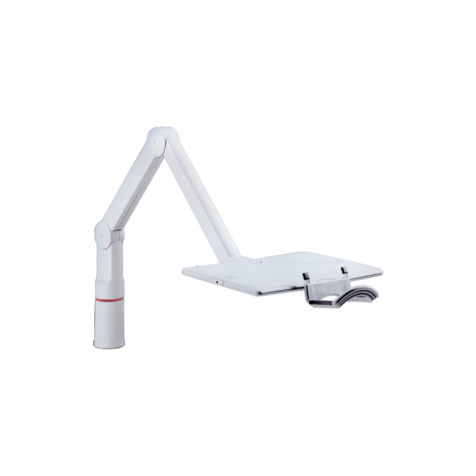 Schwenkarm mit Dreipunkt-Arretierung für Telefone bis 2 kg. Die Tragplatte (17,2 x 25,8 cm) lässt sich breit oder schmal montieren. Schwenkbereich: 360°. Höhe über der Tischfläche: 0 – 15,5 cm. Ausladung bis max. 70 cm. Lieferung mit Universalzwinge 1 (18 – 74 mm).