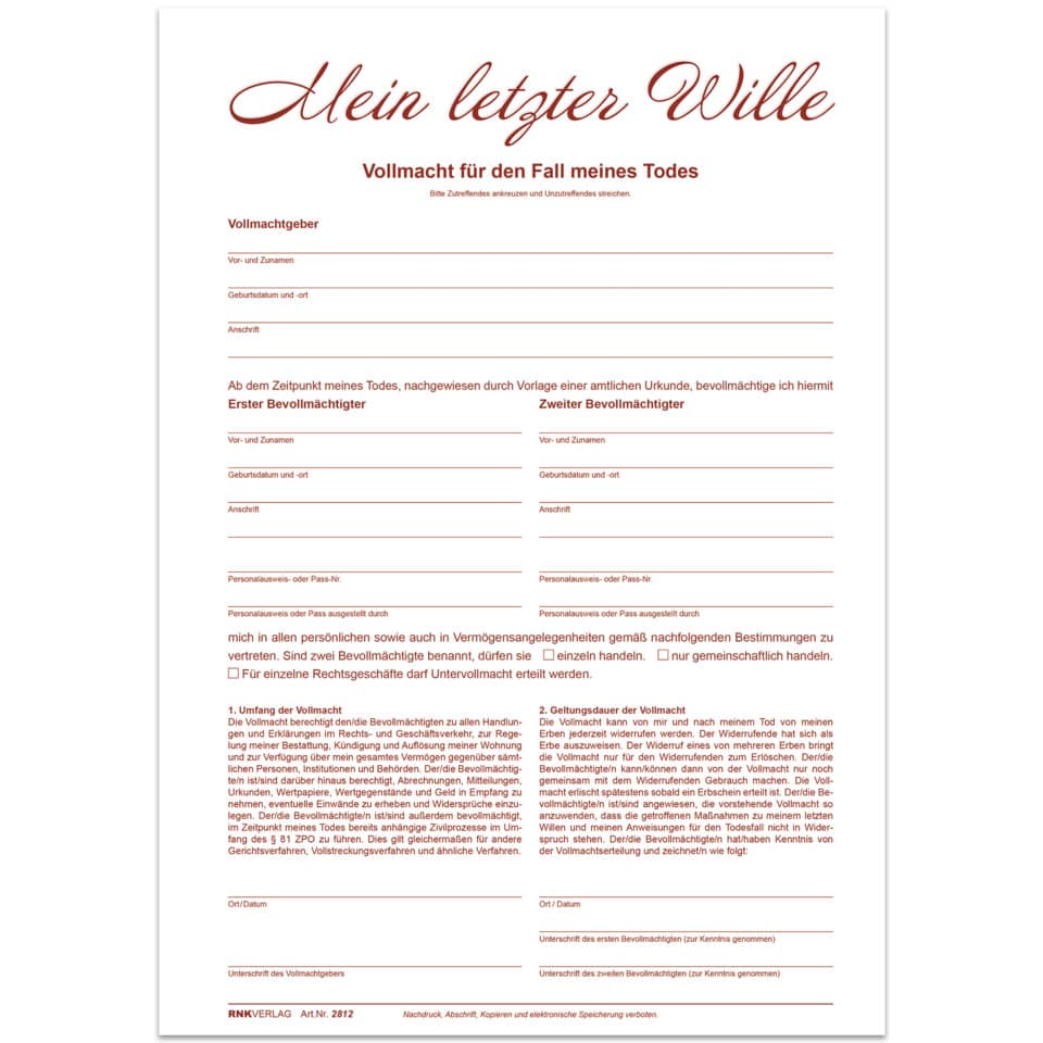 Mappe „Mein letzter Wille“, DIN A4, weinrot. Patientenverfügung, Vorsorgevollmacht, Betreuungsverfügung, Anmeldung zum Vorsorgeregister, Hinweiskarten und Erläuterungen. Art des Verschlusses: kein. Werkstoff: Feinstkarton. Stärke: 1 mm. Verwendung für Papierformate: DIN A4. Größe (B x H x T): 225 x 310 x 6 mm. Farbe: weinrot. Max. Füllhöhe an Papier: 3 mm. Art der Verpackung und Inhalt: 1 Stück.