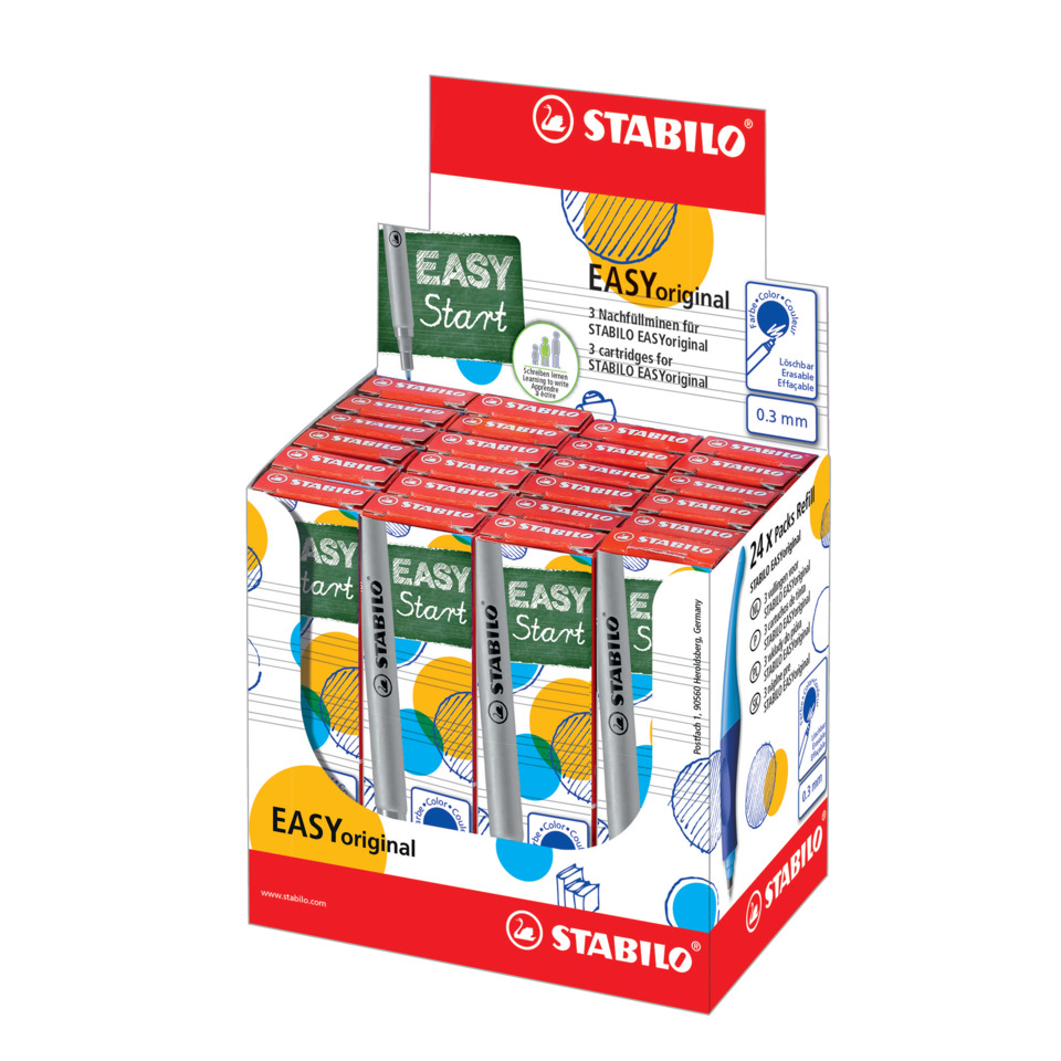 Patrone STABILO® EASYoriginal fine. Verwendung für Produkt: Tintenroller STABILO® EASYoriginal. Typbezeichnung der Mine: extralange Patrone. Art der Schreibflüssigkeit: Tinte auf Wasserbasis, löschbar, lichtbeständig gegeben. Ausführung Mine: Rollerballspitze aus Kunststoff mit Hartmetallkugel, 0,3 mm, blau. Tintenspeicher-Technik: Tamponsystem. Ausführung des Inhalts mit Packung: Faltschachtel mit 3 Patronen.