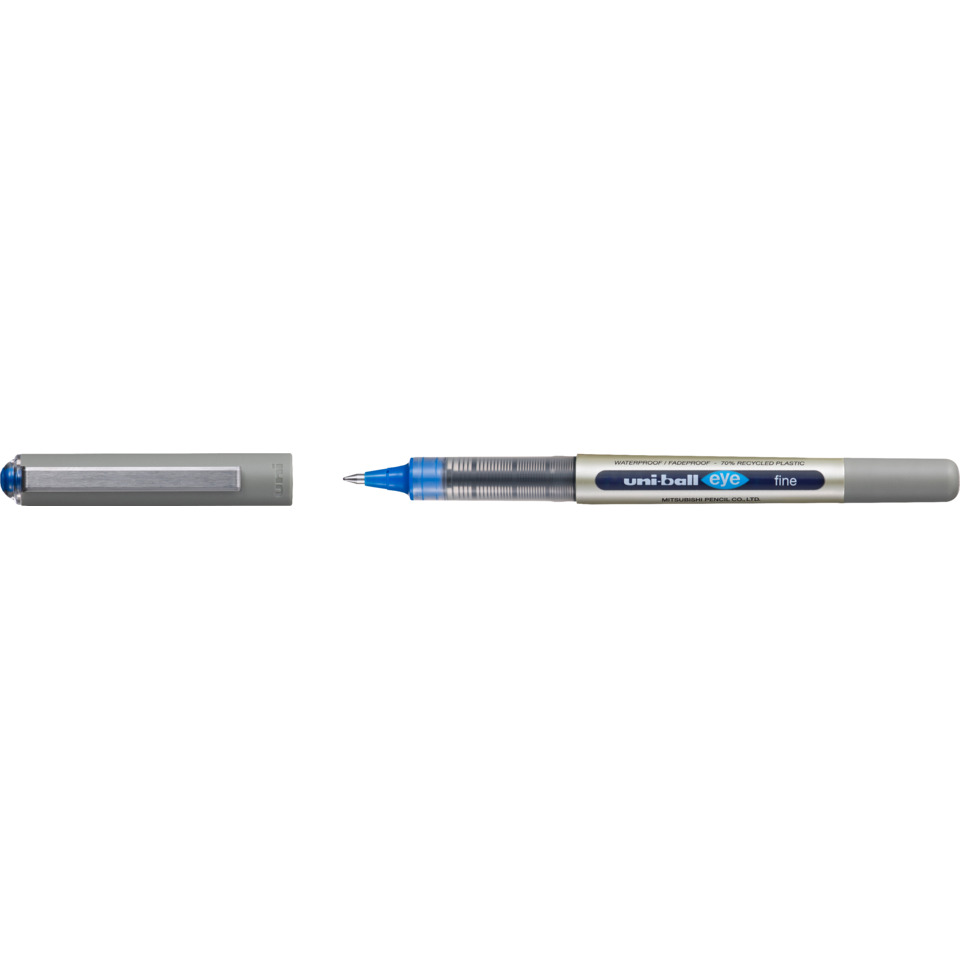 Tintenroller uni-ball® eye fine UB-157E blau. Kappenmodell. Aus 70 % recyceltem Plastik. Typbezeichnung der Mine: nicht austauschbar. Ausführung Mine: 0,4, blau, dokumentenecht. Ausführung Stift: Kunststoff, Griffzone aus Kunststoff. Ausführung Clip: Metall, metall. Tintenkugelschreiber zum Durchschreiben geeignet; Tintenstand durch Sichtfenster kontrollierbar; Metallclip; Schwarz, blau und rot dokumentenecht, lichtecht und wischbeständig. Farbe des Schaftes: grau.