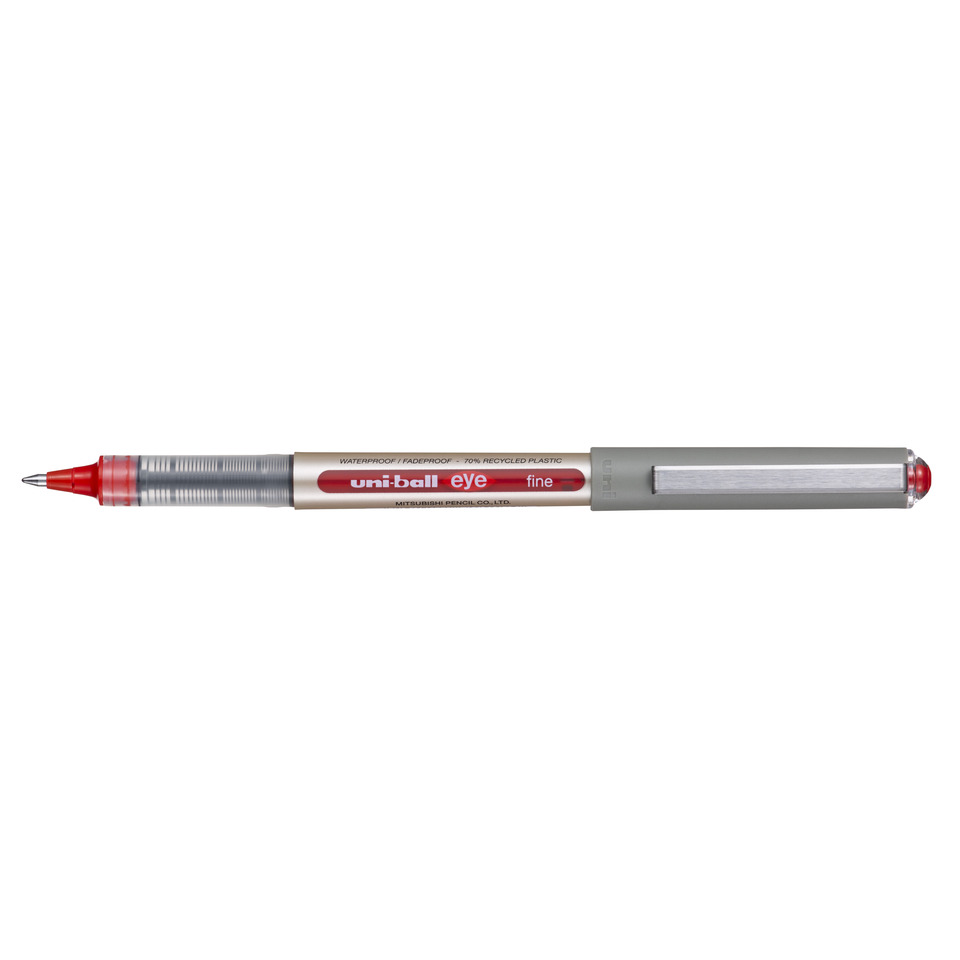 Tintenroller uni-ball® eye fine UB-157E rot. Kappenmodell. Aus 70 % recyceltem Plastik. Typbezeichnung der Mine: nicht austauschbar. Ausführung Mine: 0,4, rot, dokumentenecht. Ausführung Stift: Kunststoff, Griffzone aus Kunststoff. Ausführung Clip: Metall, metall. Tintenkugelschreiber zum Durchschreiben geeignet; Tintenstand durch Sichtfenster kontrollierbar; Metallclip; Schwarz, blau und rot dokumentenecht, lichtecht und wischbeständig. Farbe des Schaftes: grau.