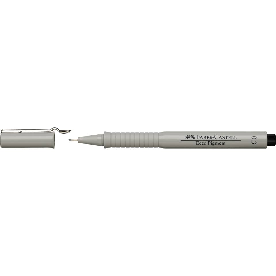 Tintenschreiber ECCO-PIGMENT 0,3 mm. Ausführung Spitze: Metallgefasste Faserspitze, 0,3, geeignet für Schablone. Art der Schreibflüssigkeit: schwarz pigmentierte Tinte, schwarz, wasserfest, dokumentenecht, lichtbeständig gegeben. Zum Zeichnen, Skizzieren und Schreiben. Lange metallgefasste Faserspitze für Lineale und Schablonen. Ergonomische Griffzone. Metallclip. Schwarze pigmentierte Tinte, besonders wasserfest und lichtbeständig. Ausführung der Griffzone: Runde ergonomische Griffzone. Farbe der Kappe: grau. Material des Clips: Metall. Farbe des Schaftes: grau. Strichstärken: 0,3 mm.