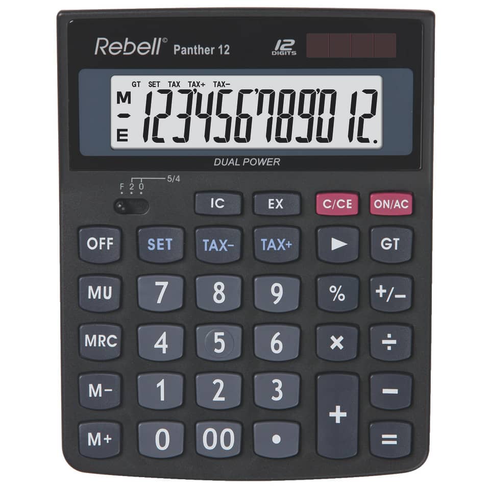 12-stelliger Tischrechner mit angewinkelter großerer Anzeige. Gut platzierte Plastik Tasten. Dual Betrieb (Solar und Batterie). Tasten % 00,, +/, OFF. 3-Tasten Speicher. Steuerberechnung (TAX+, TAX). MU Funktion (Mark-Up). Gesamtsumme (GT Funktion). Rundungs/Dezimalstellenselektor (0,2,F). Postenzähler. EX Taste (Möglichkeit die Operanten gegenüber dem Operator auszutauschen). Korrekturtaste. Praktische Gummifüsse vermeiden ein Rutschen. Maße: 147 x 115 x 32mm. Gewicht: 126g.
