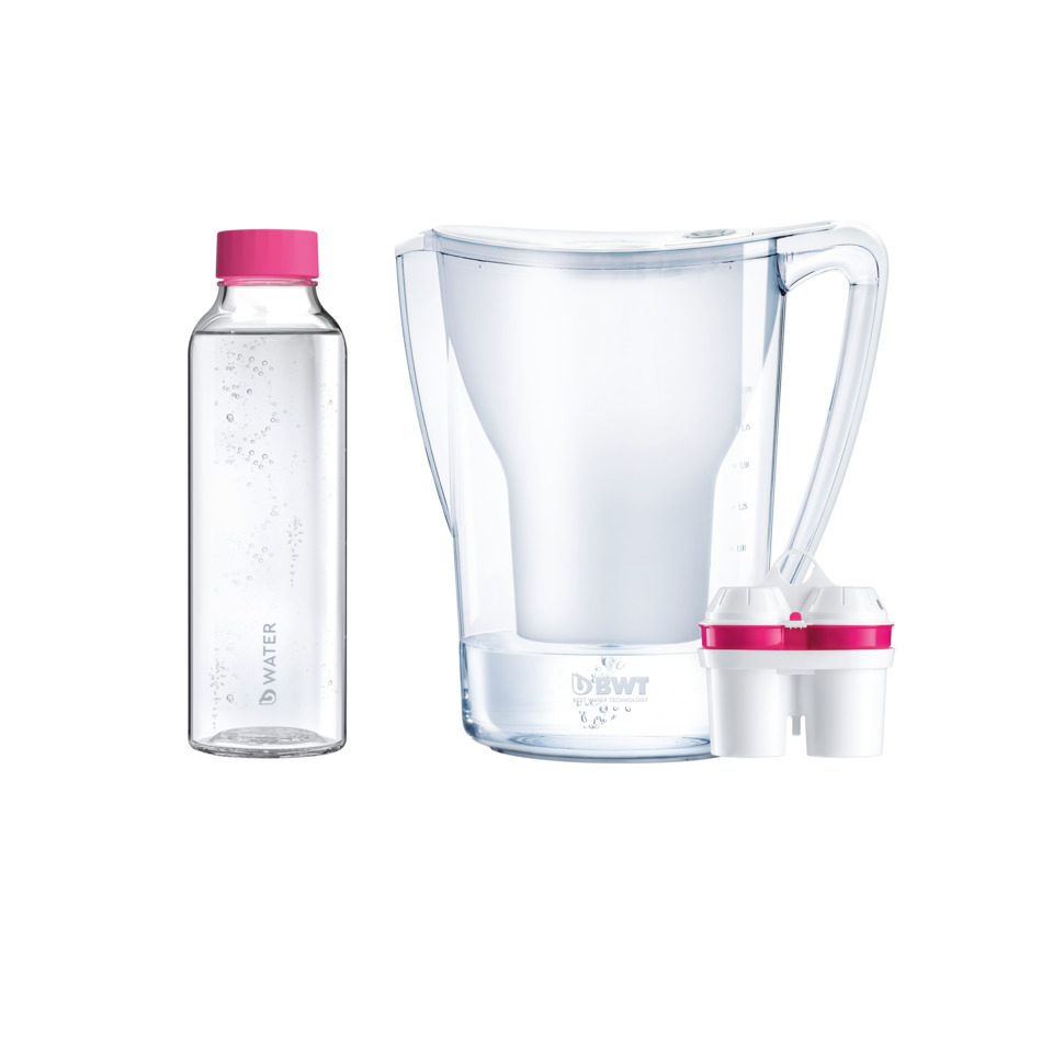Trinkwasserfilter und Magnesium-Mineralizer. AQUALIZER Home manual. Gesamtvolumen 2,6 Liter für 1,4 Liter gefiltertes Wasser. Manuelle Filterwechsel-Anzeige. Der Wasserfilter besticht durch sein attraktives Design mit optimalem ergonomischen Handling. Er ist ideal für die Zubereitung von Heiß- und Kaltgetränken sowie zum Kochen. Der Kalkgehalt des Wassers wird reduziert. Das Aktivkohle-Granulat nimmt Verunreinigungen, geruchs- und geschmacksstörende Stoffe wie z. B. Chlor aus dem Wasser auf. Schwermetalle wie z.B. Blei und Kupfer werden durch den Ionenaustauscher reduziert. Dank patentierter Magnesium-Technologie wird wertvolles Magnesium an das Wasser abgegeben. Im Wasser vorhandene Partikel werden durch den Feinfilter aus dem Wasser filtriert. Tee, Kaffee sowie Eiswürfel sind klar im Aussehen. Kaffee-, Espressomaschinen, Kochtöpfe und Wasserkessel verkalken weniger und haben dadurch eine längere Lebensdauer. Zudem sparen Sie nicht nur bares Geld, sondern auch das mühevolle Schleppen schwerer Wasserflaschen, wenn Sie gefiltertes Wasser als Trinkwasser benutzen. Das Produkt ist BPA frei und kann ganz einfach in der Spülmaschine gereinigt werden (außer Deckel). Das kompakte Design lässt ihn in jede handelsübliche Kühlschranktür Platz nehmen. Einfaches Befüllen Easy-Fill ohne Spritzer (Die Einfüllklappe öffnet automatisch, sobald der Wasserstrahl auftritt. So kann der Tischwasserfilter ohne Wasserspritzen befüllt werden). Easy-Control Anzeige zum Filterwechsel. Filterwechsel nach 28 Tagen empfohlen. Inklusive 1 BWT Echt-Glasflasche (750 ml) und 1 Filterkartusche. Nutzungsdauer ca. 120 Liter. Gewicht ca. 0,65 kg. Größe BxHxT: 11,3 x 27,8 x 25,2 cm. Farbe: transparent.