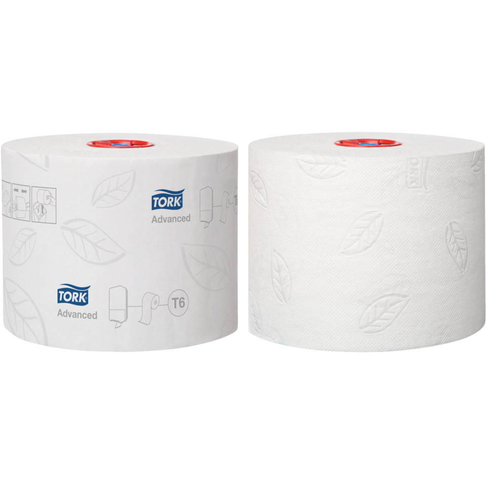Compact Toilettenpapier für Tork T6 System. Einzigartige, graue bzw. lilafarbene Lorbeerblattprägung, optimale Lagenhaftung und Weichheit, unperforiert und hochweiß. Ideale Lösung für Waschräume mit mittleren bis hohen Besucherzahlen, wo hoher Wert auf Design und Hygiene gelegt wird.