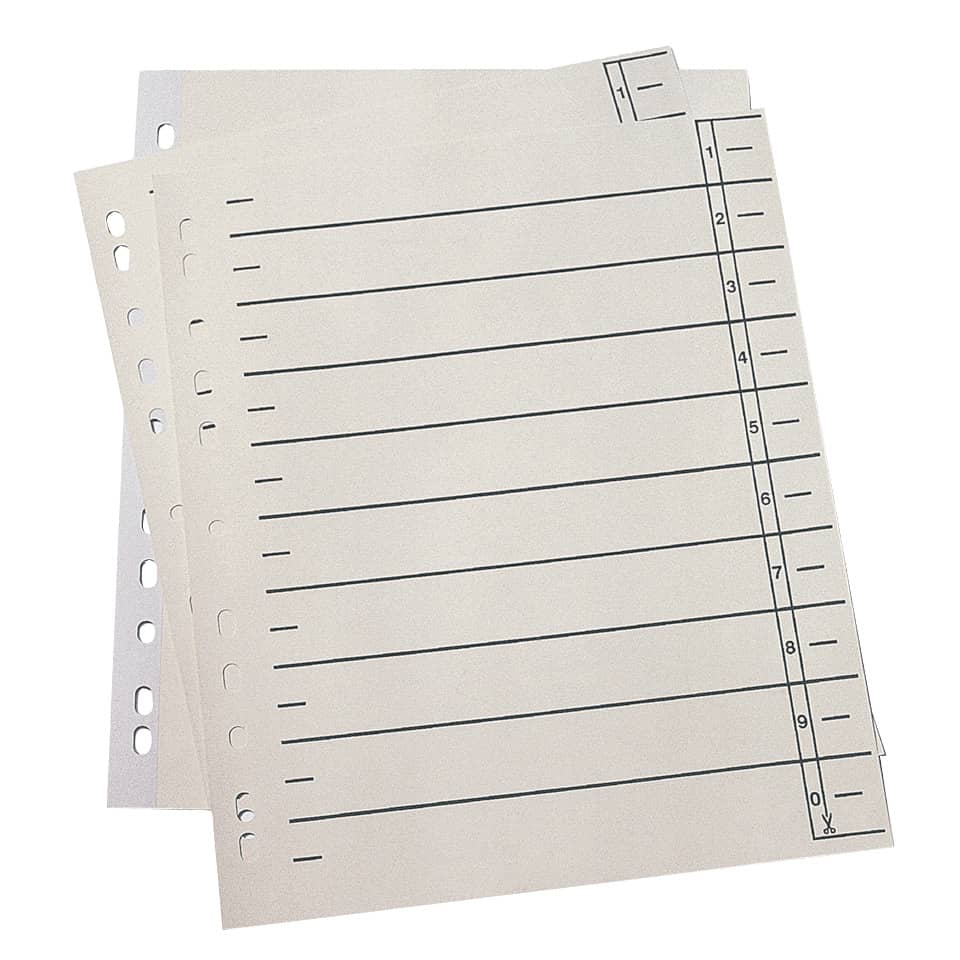Aus 190 g/qm Kraftkarton (RC) Die Register-Taben können an jeder Stelle ausgeschnitten werden. Linienaufdruck. Maße: 240 x 300 mm (B x H).