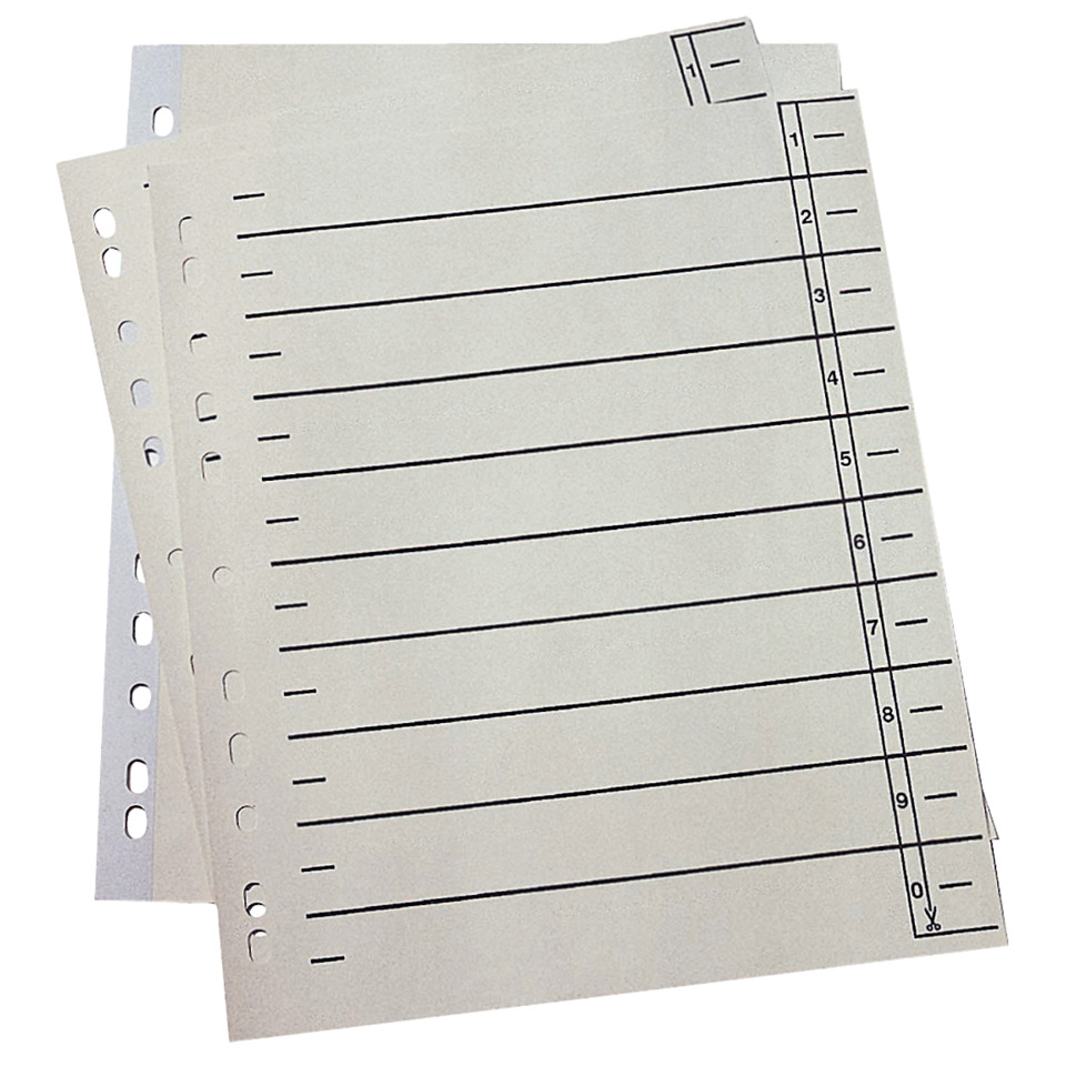 Aus 230 g/qm Kraftkarton (RC) Die Register-Taben können an jeder Stelle ausgeschnitten werden. Linienaufdruck. Maße: 240 x 300 mm (B x H).
