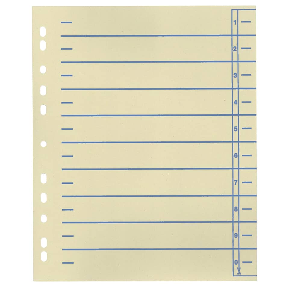 Aus 230 g/qm Kraftkarton (RC).Die Register-Taben können an jeder Stelle angeschnitten werden. Taben mit farbigem Organisationsdruck. Linienaufdruck. Eurolochung. Maße: 240 x 300 mm.