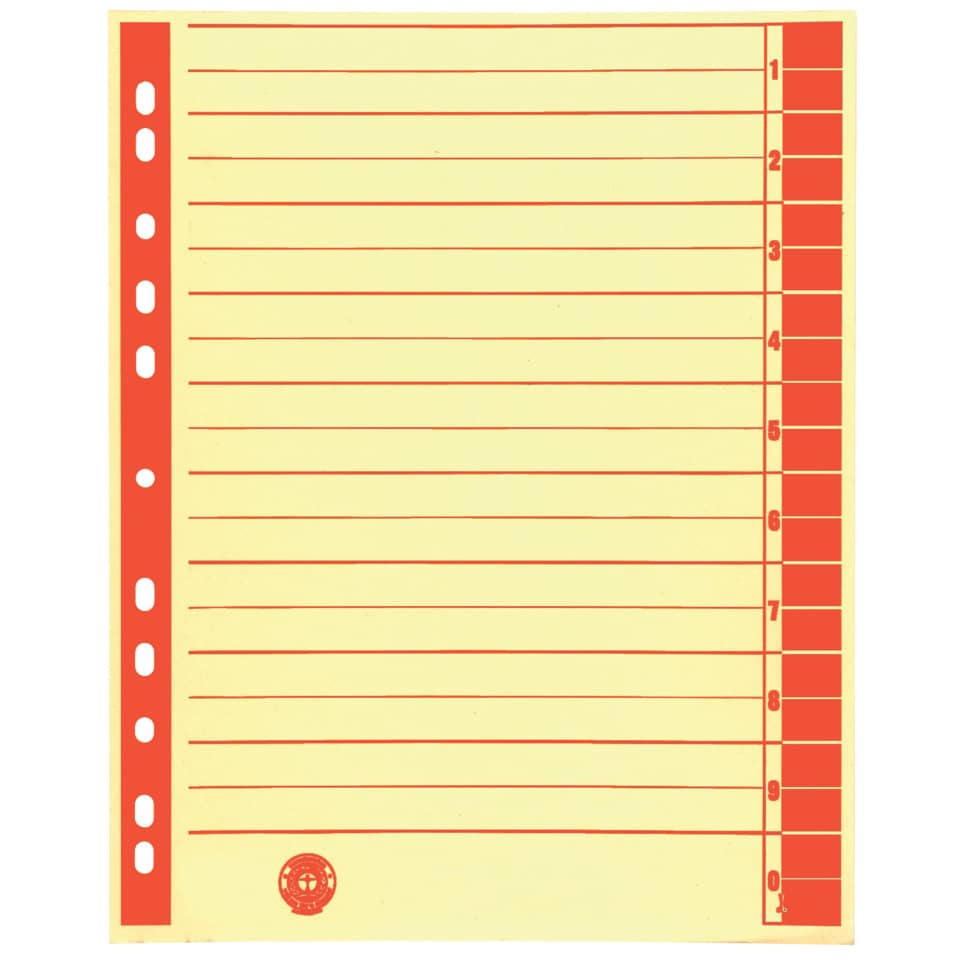Aus 230 g/qm Kraftkarton (RC).Die Register-Taben können an jeder Stelle angeschnitten werden. Taben mit farbigem Organisationsdruck. Linienaufdruck. Eurolochung. Maße: 240 x 300 mm.