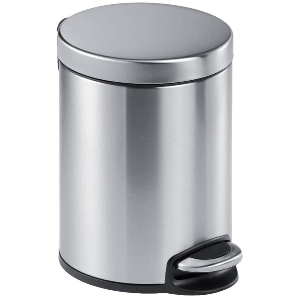 Treteimer. Material und Form: Edelstahl, rund. Anzahl der Sortierfächer: 1. Ausstattung: Deckel vorhanden. Mit Fingerprint-Proof Beschichtung, herausnehmbarer Innen-Eimer mit Henkel, geräuschloses schließen des Deckels, sicherer Stand und Korrosionsschutz durch umlaufenden Kunststoffsockel, integrierter Tragegriff am Deckelscharnier. Durchmesser: 205 mm. Höhe: 290 mm. Tiefe: 260 mm. Volumen: 5 l. Farbe: metallic silber.