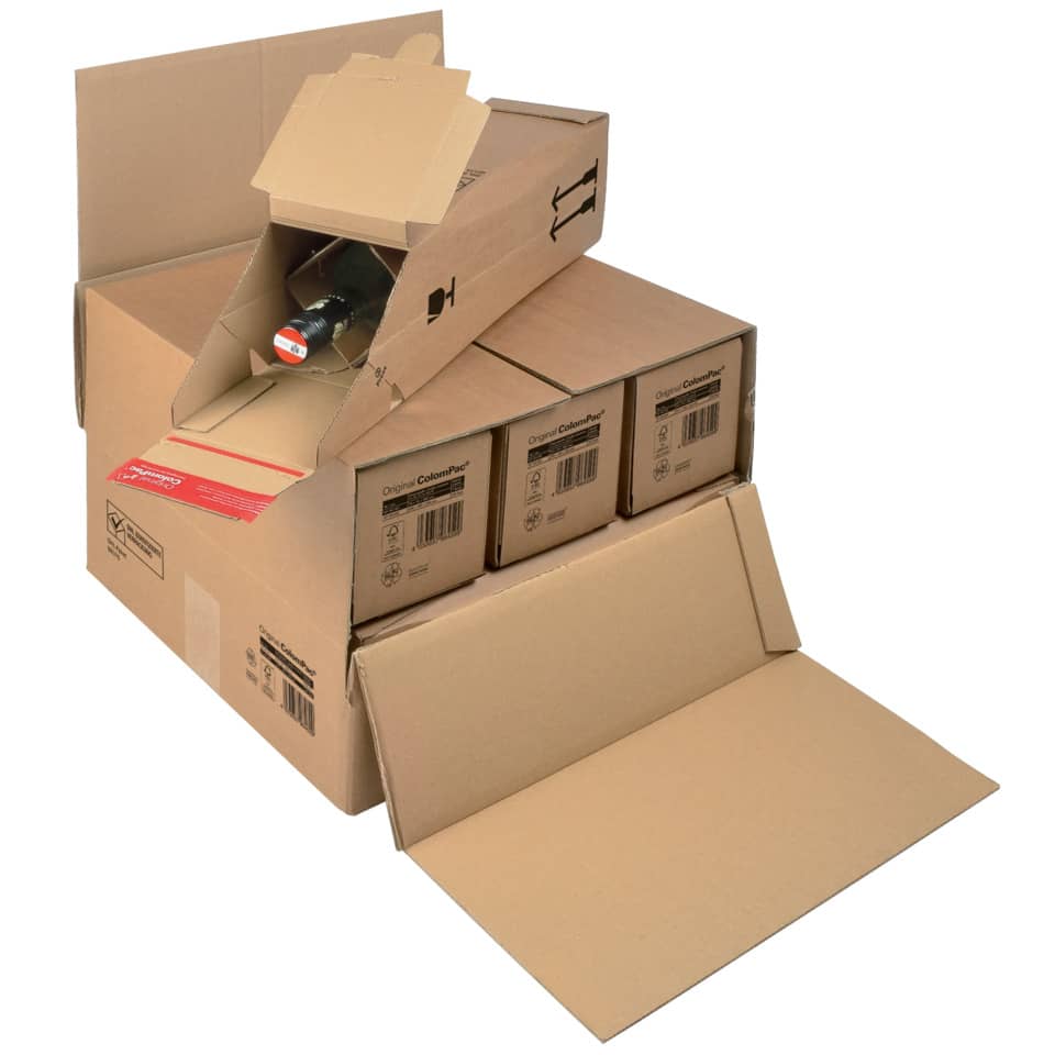 Umkarton für 3 oder 6 Einzelflaschenkartons – geeignet für den sicheren Versand von z.B. 0,75 Liter Weinflaschen. Einfach und schnell aufgebaut. Flache Anlieferung und Handlingsvorteil durch einteilige Ausführung. Maximale Flaschenhöhe: 300 mm.
