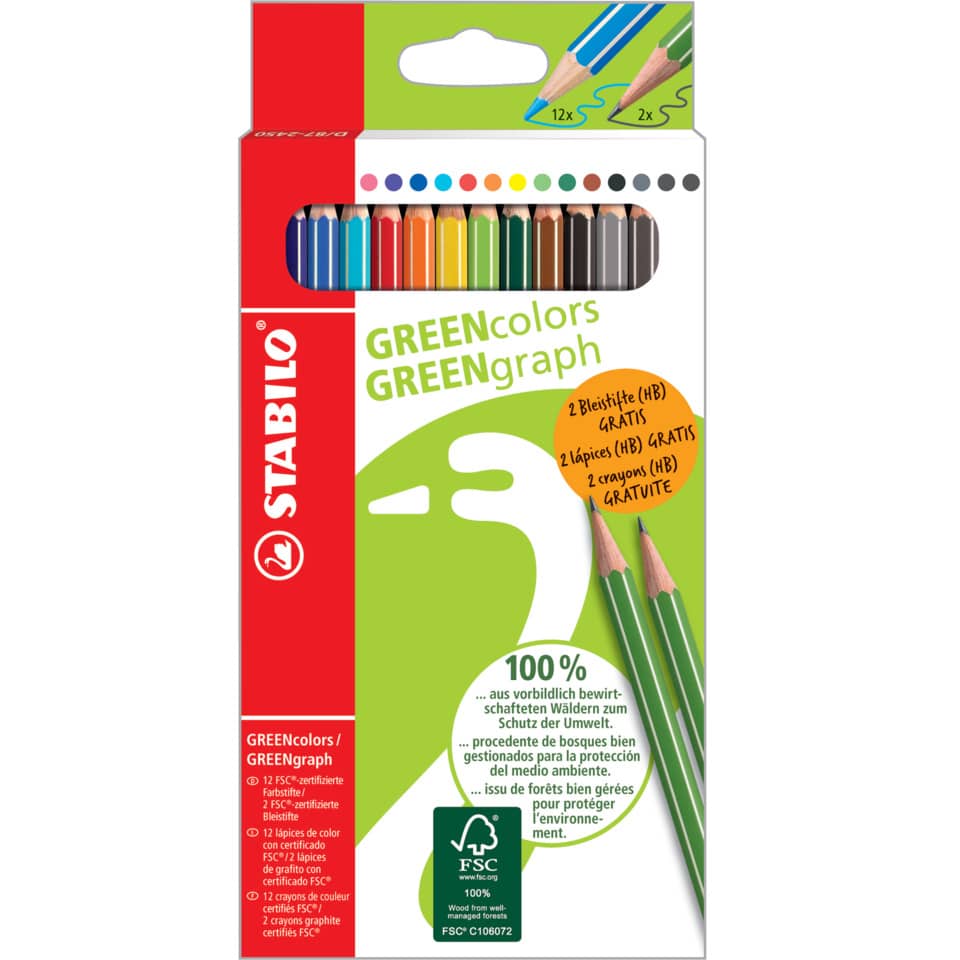 STABILO® GREENcolors. Buntstift STABILO® GREENcolors Promoetui 12 + 2. Intensive, brillante Farben. Ausführung Mine: Bezeichnung der Härte: -. Stärke der Mine: 3 mm (Buntstifte) + 2,2 mm (Bleistifte), Schreibfarbe der Mine: sortiert. Ausführung Schaft: Schaft lackiert. Ausführung der Schaftform: sechskantig, Farbe des Schaftes: in Schreibfarbe mit naturweißen Kantenstreifen. Material des Schaftes: Weymouths-Kiefer. Größe Stift (Ø x L): Durchmesser: 8 mm, Länge: 175 mm. Art der Verpackung und Inhalt: Ausführung der Lieferzusammenstellung: 12 + 2. Ausführung des Inhalts mit Packung: Kartonetui mit 12 Buntstiften + 2 Bleistiften (gratis), Zertifikat/Zulassung: AAB426, AAB492, DAA603