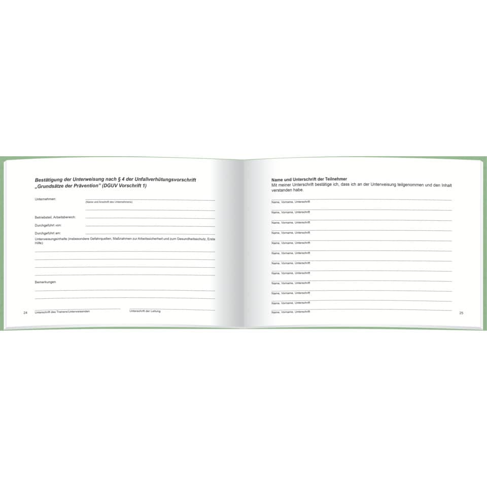Aufgrund der Unfallverhütungsvorschriften ist jeder Unternehmer verpflichtet, seine Mitarbeiter über die bei ihren Tätigkeiten auftretenden Gefahren sowie Maßnahmen der Unfallverhütung mindestens einmal jährlich zu unterweisen. Das Unterweisungsbuch dient dem Nachweis der Unterrichtung.