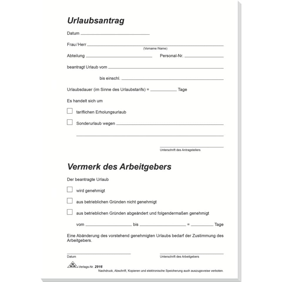 Mit diesem Urlaubsantrag kann der Arbeitnehmer seinen Antrag auf Erholungs-oder Sonderurlaub stellen und der Arbeitgeber die Genehmigung erteilen. 1. Blatt weiß perforiert, 2. Blatt gelb perforiert.