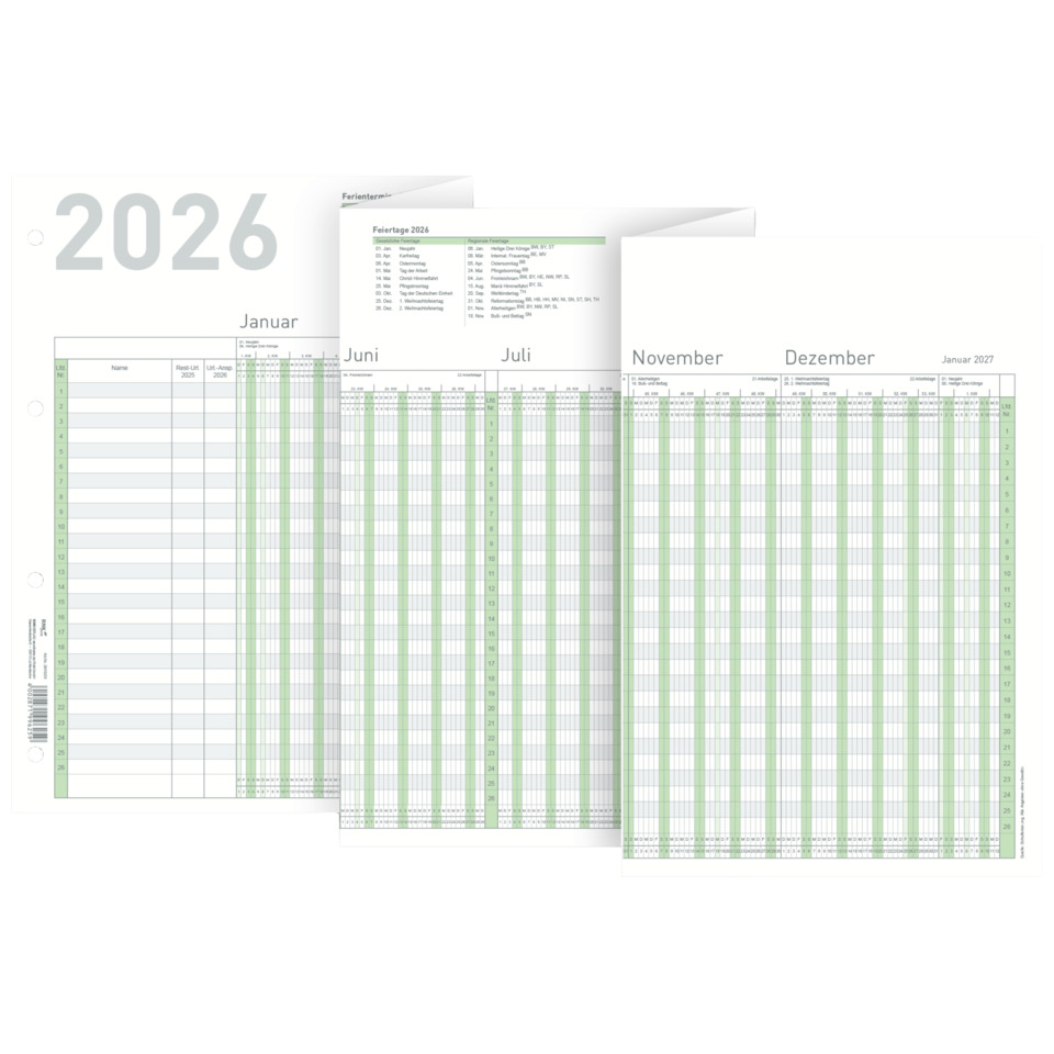 Urlaubsplaner 2026, Maße (BxH): 1000 x 297 mm, gefalzt auf DIN A4, Kalendarium mit Angabe der Ferientermine, gefalzt auf DIN A4, gelocht, Ausführung der Kalenderaufteilung: Monat/Tage, Druckfarbe: schwarz/grün/weiß, Wochenzählung vorhanden, Ausführung der Sprachauswahl: deutsch, Größe (B x H): 1000 mm, 297 mm, Material: Papier.
