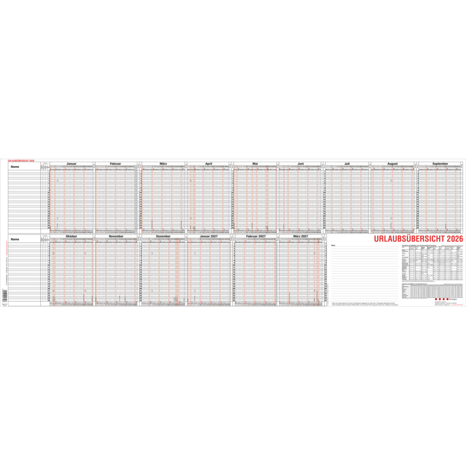 Um einen sicheren Überblick über die An- und Abwesenheit von Mitarbeitern zu gewinnen, sind durchdachte Planungsinstrumente wichtig. Urlaubsübersicht. 15 Monate, d.h. von Januar bis März des folgenden Jahres. Für Wand und Schreibtisch. Hinter jedem Monat Spalte für Resttage. Namenszeilen abwechselnd gerastert. Schulferien. Notizfeld. 2farbiger Druck, Sonn- und Feiertage in Rotdruck. Für 25 Mitarbeiter. Größe: 100 x 35 cm (B x H), gefalzt auf DIN A4. Material Karton.