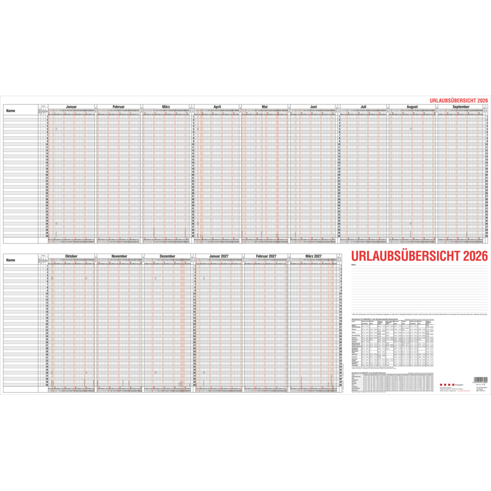 Um einen sicheren Überblick über die An- und Abwesenheit von Mitarbeitern zu gewinnen, sind durchdachte Planungsinstrumente wichtig. Urlaubsübersicht. 15 Monate, d.h. von Januar bis März des folgenden Jahres. Hinter jedem Monat Spalte Resttage. Sonn- und Feiertage in Rotdruck. Für 40 Mitarbeiter. Größe: 100 x 60 cm (B x H). Material Karton.