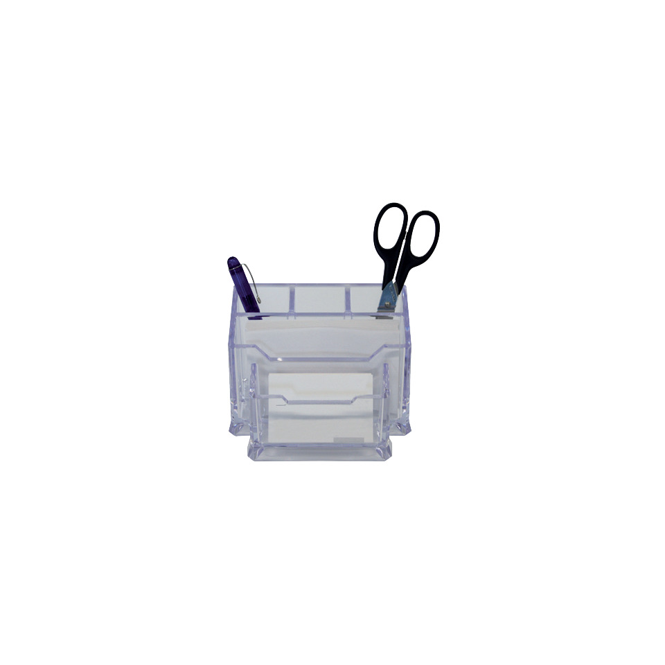 Bürobutler Utensilienbox Acryl – 10×15 cm, 6 Fächer = 3 Köcher + 2 Utensilienfächer, gefüllt mit ca. 100 Blatt weißem Papier.