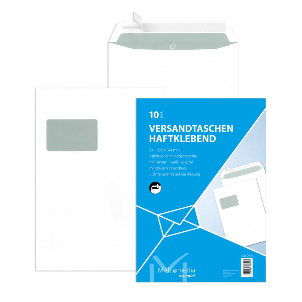 Versandtasche · Format: C4 · Größe: 324 x 229 mm (B x H) · haftklebend mit Abdeckstreifen · mit Fenster · Offset weiß mit Innendruck · Papiergewicht: 120 g/qm · Packung mit 10 Stück