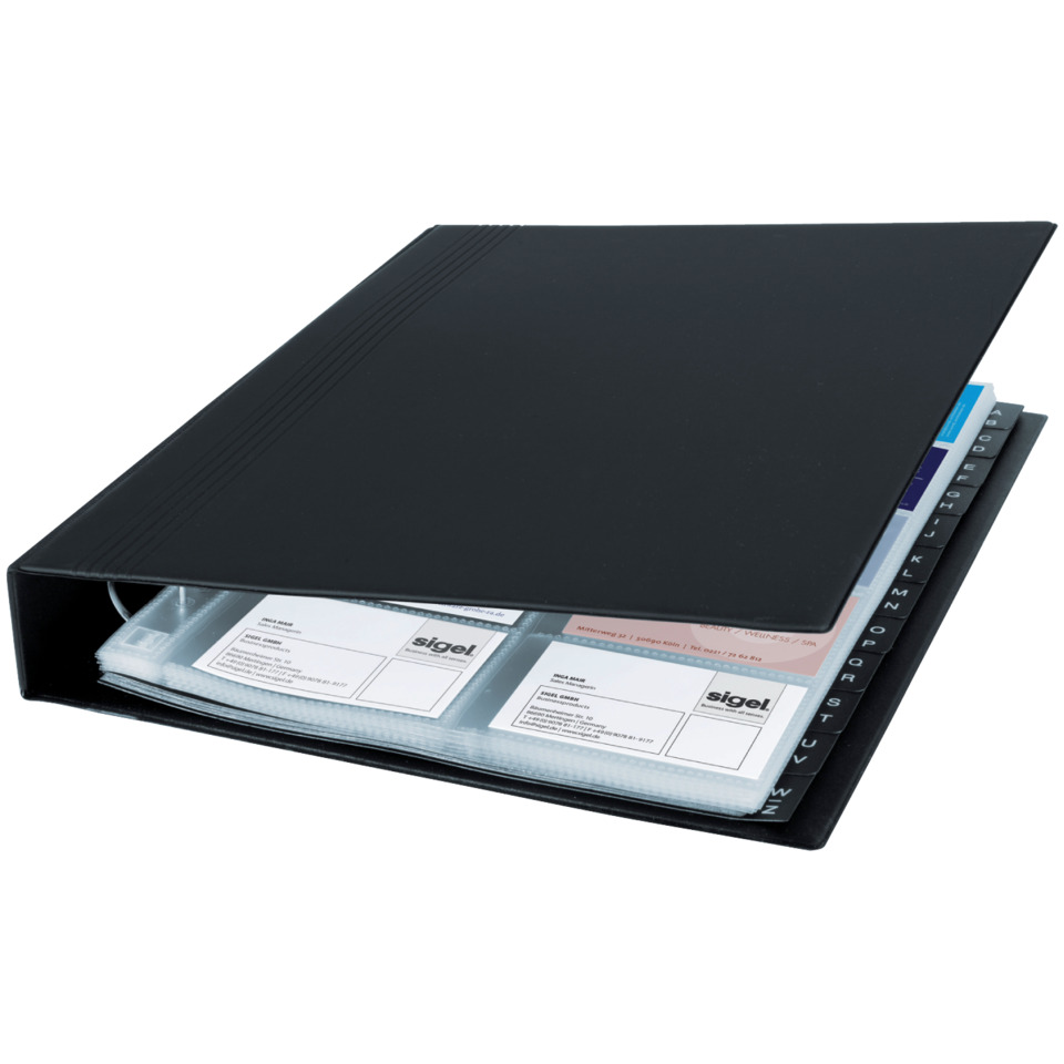 Elegantes Visitenkarten-Ringbuch im grossen A4-Format, mit matt-satinierter Oberfläche. Für die perfekte und übersichtliche Archivierung von Visitenkarten und anderen Karten. Mit stabiler 4-Ringmechanik und alphabetischem Register für schnelles Einsortieren und Wiederfinden. 20 transparente Hüllen bieten Platz für 400 Karten bis max. 90×58 mm. Tipp: Passende Nachkaufhüllen – Artikelnummer 766614.