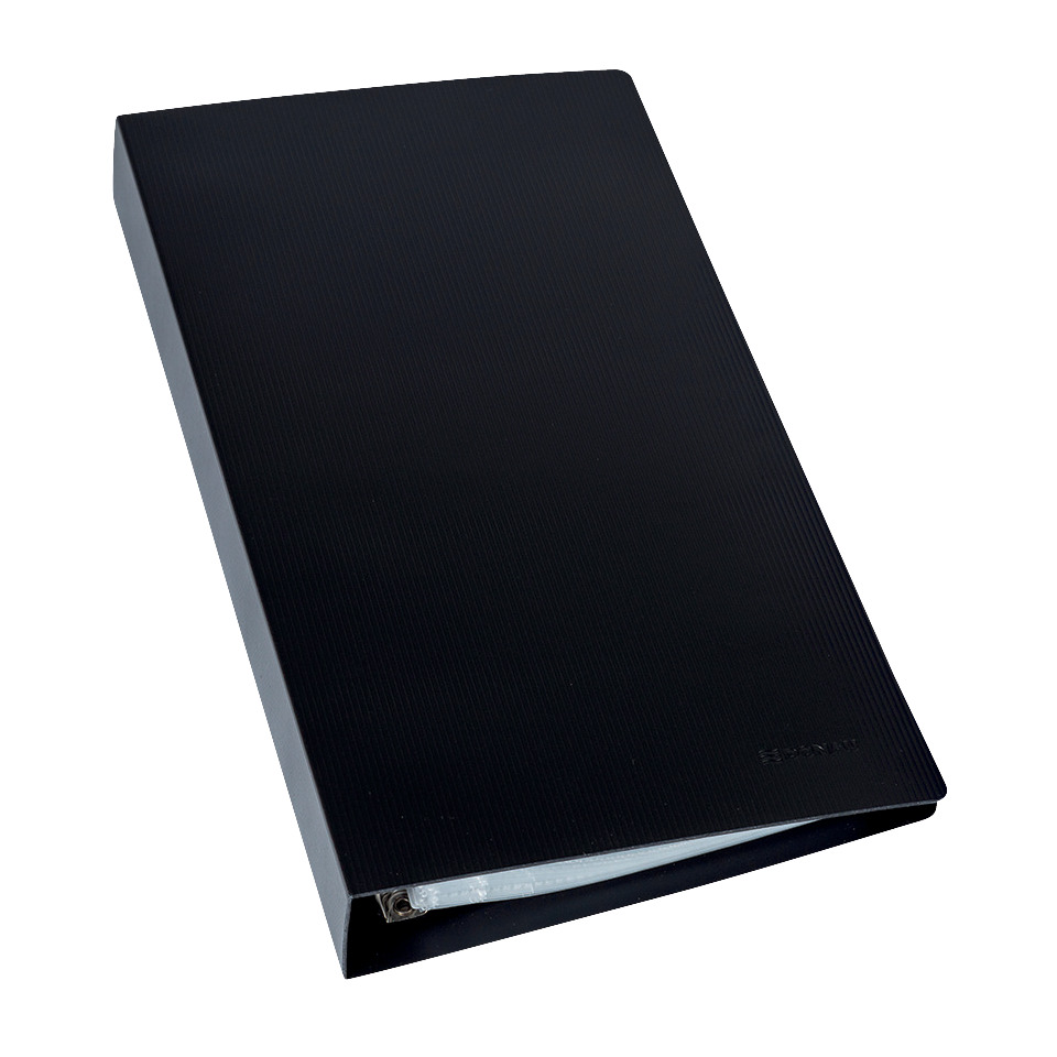 Visitkarten-Ringbuch in hochwertiger Kunststoff-Ausführung mit strukturierter Polypropylen Oberfläche. PP-Materialstärke ca. 1 mm. Komplett mit Kunststoff A-Z Register grau; sowie 21 Hüllen mit 5 Fächern. Geeignet für 210 Visitenkarten im Format 9,0 x 5,7 cm bei beidseitiger Belegung. Ringbuch mit 4 Ring D-Mechanik 20 mm Innendurchmesser. Größe der Mappe: BxHxT: 17,0 x 32,0 x 3,5 cm. Farbe: schwarz