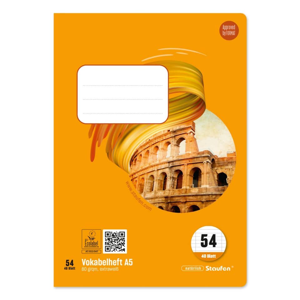 Vokabelheft Style. Ausführung Papier: ECF, 80 g/m². Ausstattung: Heftung am Rücken. Papierformat: DIN A5 = 14,8 cm x 21,0 cm. Lineatur/Lineatur-Nr.: 9mm liniert mit 2 MST, 54. Anzahl der Blätter: 40 Blatt. Farbe des Einbandes: farbig mit Motiv.