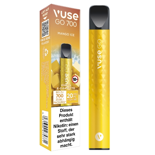 Vorbefüllt mit 2.0 ml Liquid bis zu 700 Züge Einfache Zugautomatik, keine Einstellungen erforderlich Nicht wiederbefüllbar und nicht wiederaufladbar Geschmack: Mango und Menthol Vuse Go 700 Einweg E-Zigarette Mango Ice 20mg