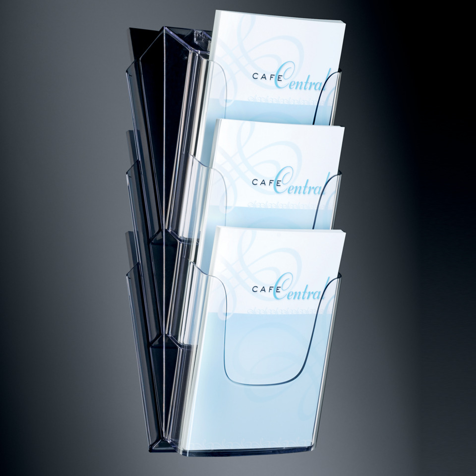 Wand-Prospekthalter. Wand-Prospekthalter, mit drei Fächern, Fülltiefe 30 mm