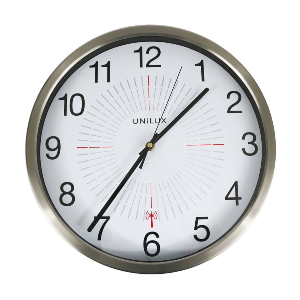 Ursprünglich spezialisiert auf Leuchten hat UNILUX sein Sortiment in den vergangenen Jahren um Ergonomie-Produkte und Einrichtungs-Accessoires erweitert. Heute bietet die Marke ein breit gefächertes Sortiment, um Arbeitsumgebungen entsprechend individueller Bedürfnisse einzurichten, für mehr Wohlbefinden im Büro. Diese Uhr hat ein regenfestes Gehäuse aus Metall und Glas. Daher eignet sie sich auch für geschützte Außenbereiche. Über ein Funksignal wird die Uhrzeit stets ganz genau angezeigt. Die Zeitumstellung erfolgt automatisch. Schleichende Zeiger bewegen sich kontinuierlich ohne Tickgeräusche und beeinträchtigen die Konzentration daher nicht. Der Durchmesser von 35,5 cm macht die Uhr auch aus großer Entfernung gut lesbar. Eine Batterie (AA, 1,5 V) wird mitgeliefert.
