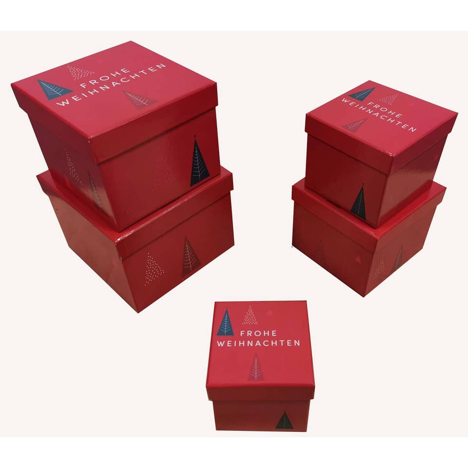 Kartons die perfekt für Ihre Geschenke geeignet sind, wenn sie hochwertige Verpackung suchen. Die Geschenkkartons bestehen aus hochwertigem Material und sind besonders stabil. 10x10x9,5cm bis 18x18x13,5cm, mit Aufschrift „Merry Christmas“ auf dem Deckel.