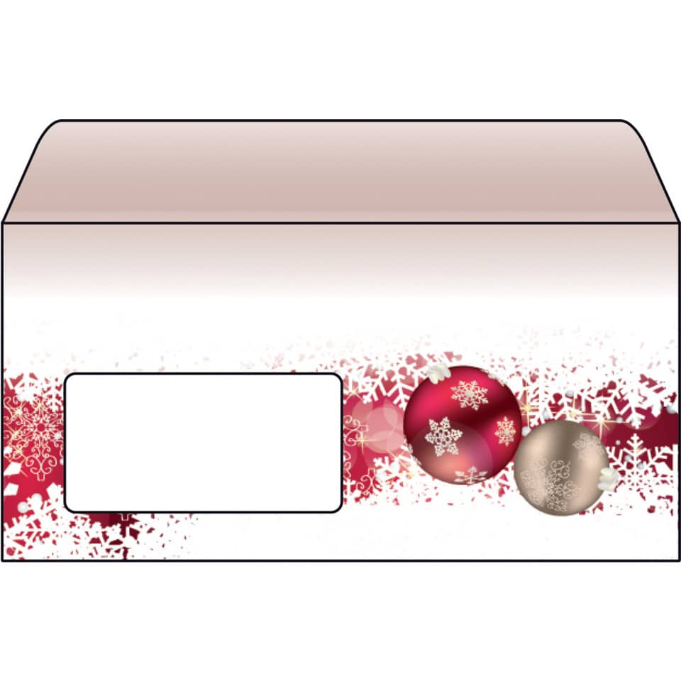 Stilvolle Weihnachtsumschläge „Frozen“ (Motiv: Weihnachtskugeln in weiß, rot) im Format DIN lang, 50 Stück mit gummierter Klappe. Überraschen Sie Geschäftspartner, Mitarbeiter, Kollegen oder auch Freunde und Familie mit exklusiven Grüßen zur Weihnachtszeit. Individuell und unkompliziert bedruckbar – für Ihre persönliche und einzigartige Weihnachtspost im Handumdrehen. Keine Abhängigkeit von Druckereien, geringe Auflagen ganz nach Bedarf – und das in Premiumqualität.