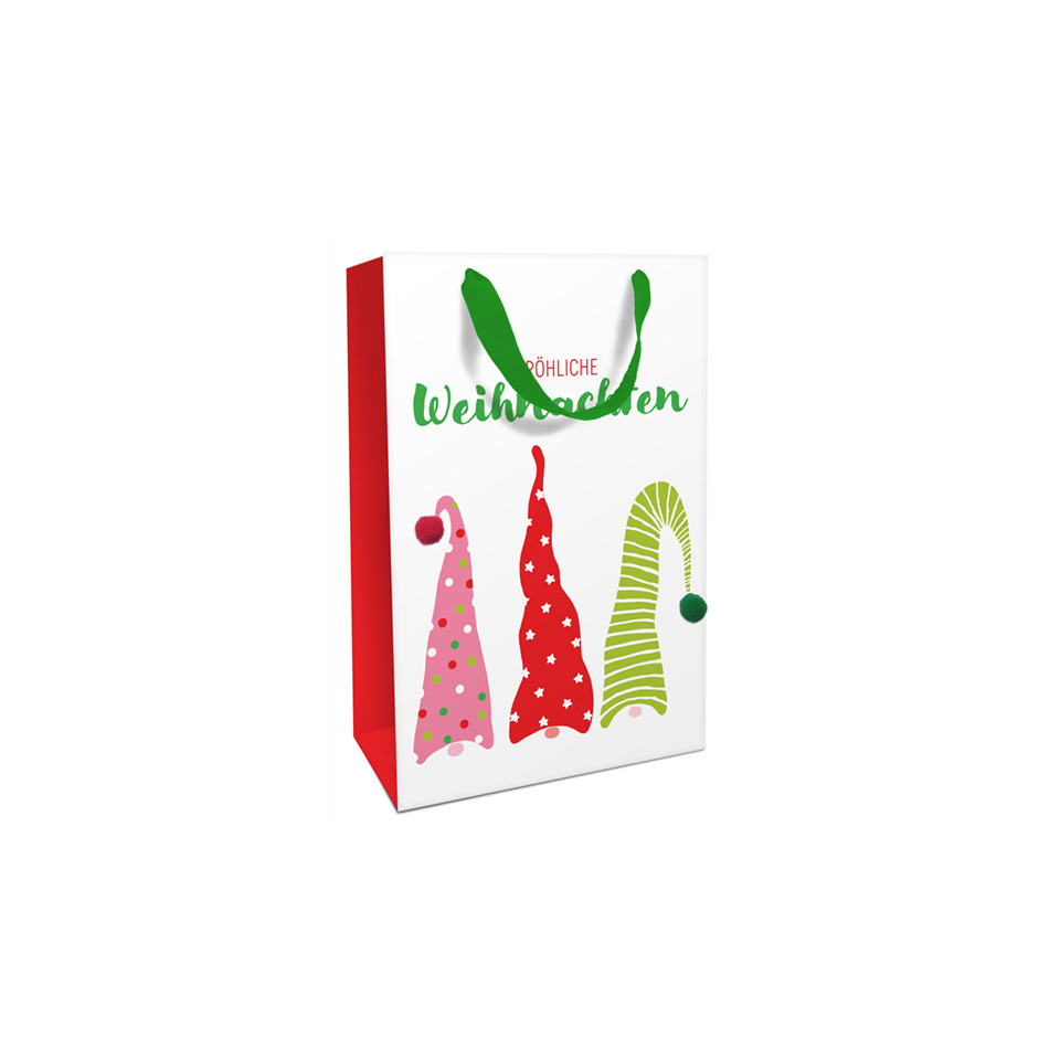 Die matte Geschenktragetasche Wichtelmützen überzeugt mit kleinen Bommeln als liebevolles Detail und einem grünen Trageband. Mit den Maßen 36 x 26 x 13 cm bietet sie ausreichend Platz für größere Geschenke.
