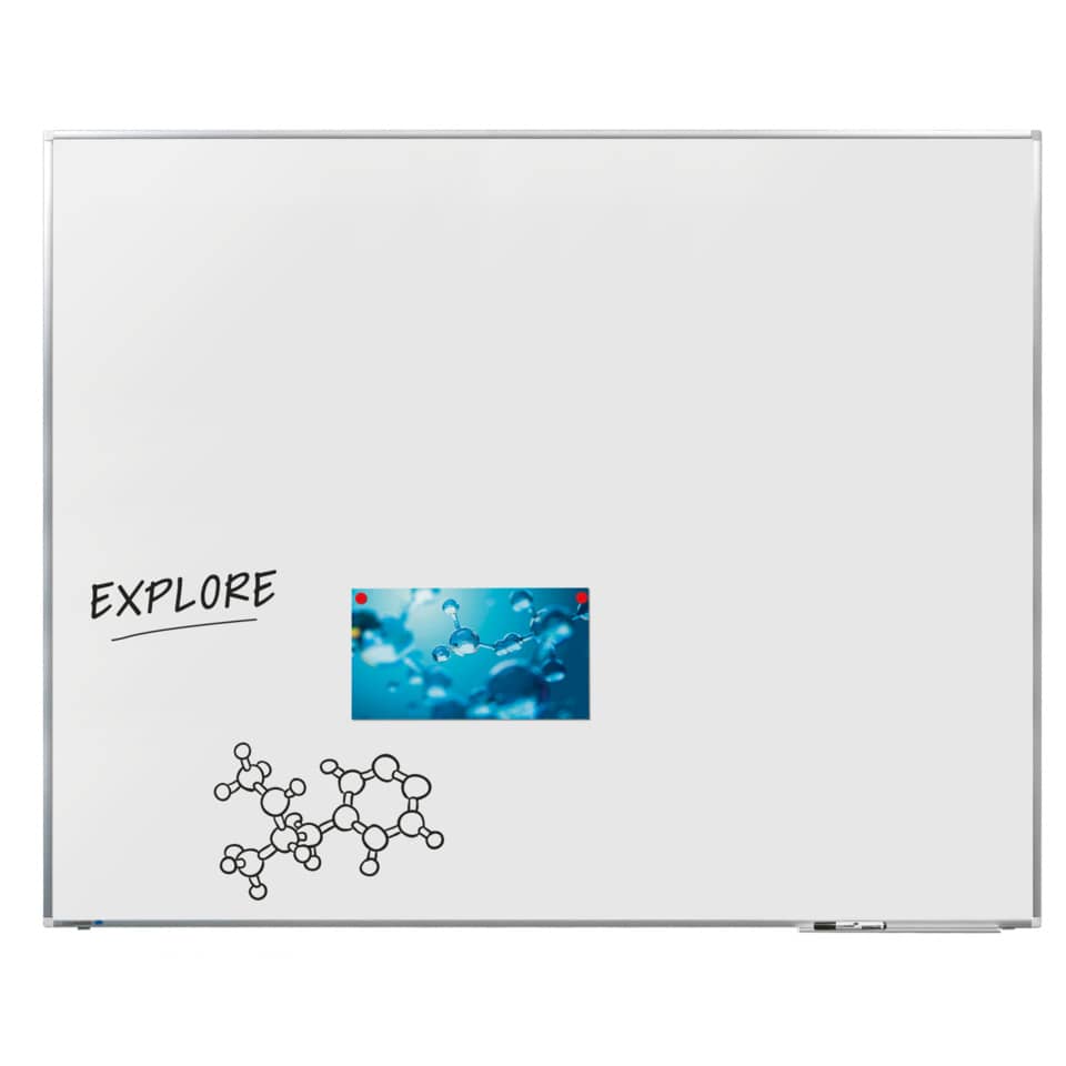 Legamaster Whiteboard PREMIUM PLUS. Weiße Schreibtafel. Email-Tafeloberfläche, eingebrannt bei 800°C, magnethaftend, beschreibbar mit trocken abwischbaren Boardmarkern, säurefest und unempfindlich gegen scharfe Reinigungsmittel. Beschriftung lässt sich auch nach längerer Zeit noch gut abwischen. Auch falsch eingesetzte Marker (z.B. Permanent Marker) lassen sich ohne Oberflächenbeschädigung entfernen. Aluminiumrahmen mit weißen Kunststoffecken. Mit Ablagebord, 30 cm. Wandmontage mit verdecktem Langlochsystem. Lieferung inklusive Boardmarker. Größe: 120 x 150 cm (B x H).