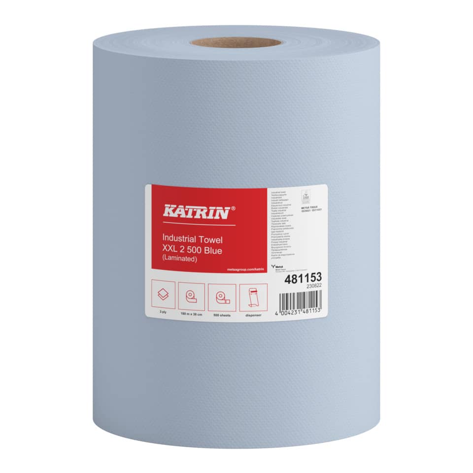 Rollenbreite 380 mm, Rollenlänge 190 m, Gesamtdurchmesser 280 mm, Kerndurchmesser 71 mm. 500 Abrisse, Blattgröße 380 x 380 mm. Blue laminated, Industrielles Trockenpapier aus Mischfaser, Verleimt, für besondere Stärkebeim effektiven Trocknen. Zertifiziert mit dem Nordic Swan und EU-Ecolabel Umweltzeichen.