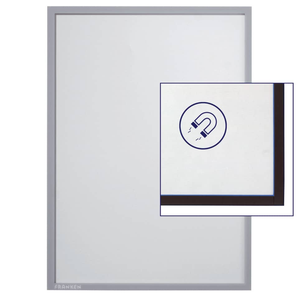 FRANKEN Dokumentenhalter Xtra!Line magnetisch. Für DIN A4. Für die Präsentation und Hervorhebung von Notizen. Auf drei Seiten der Rückseite mit Magnetstreifen. Schneller Austauchs von Dokumenten durch die offene Rückseite. Matt, dokumentenecht. Mit Papiereinlage. Auf drei Seiten der Rückseite mit Magnetstreifen. Mit farbigem Rand. Material: Hartfolie, 0.32 mm. Format: 250 x 320 x 2 mm. Farbe: grau.