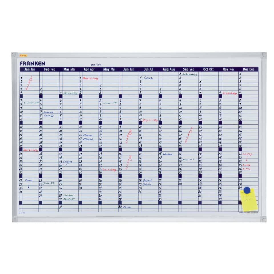 X-tra!Line® Kalender. Produktverwendung: Jahresübersicht. Ausführung der Zeiteinteilung: 12 Monate. Farbe: weiß. Tafel magnethaftend. Tafel beschreibbar. Oberflächenbeschaffenheit: lackiert. Januar bis Dezember in deutsch und englisch fest eingedruckt.. Material des Rahmens: Aluminium (12 mm dick) mit Kunststoffecken. Farbe des Rahmens: silbereloxiert, Ecken hellgrau. Ablageschale vorhanden. Zubehör für Wandbefestigung: Spiegelaufhängung. Abmessung des Rasters: Tagesfeld: 14 x 58 mm. Größe (B x H): 90 x 60 cm.