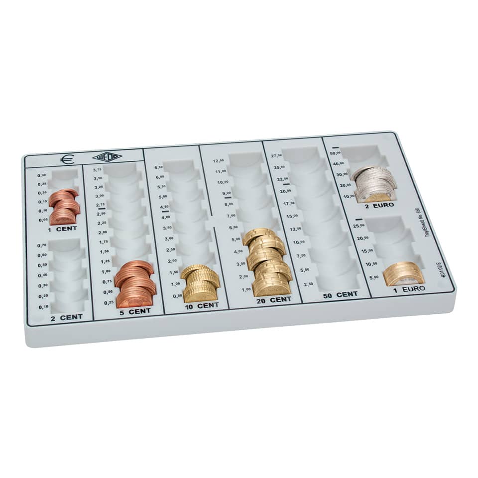 Hartgeldeinsatz mit 8 Münzräumen in 6 Reihen aus Polystyrol. Wischfeste Wertskala. 4 rutschfeste Gummifüße. Fassungsvermögen Hartgeld: 125,75 Euro. Größe (B x T x H): 263 x 161 x 31 mm.