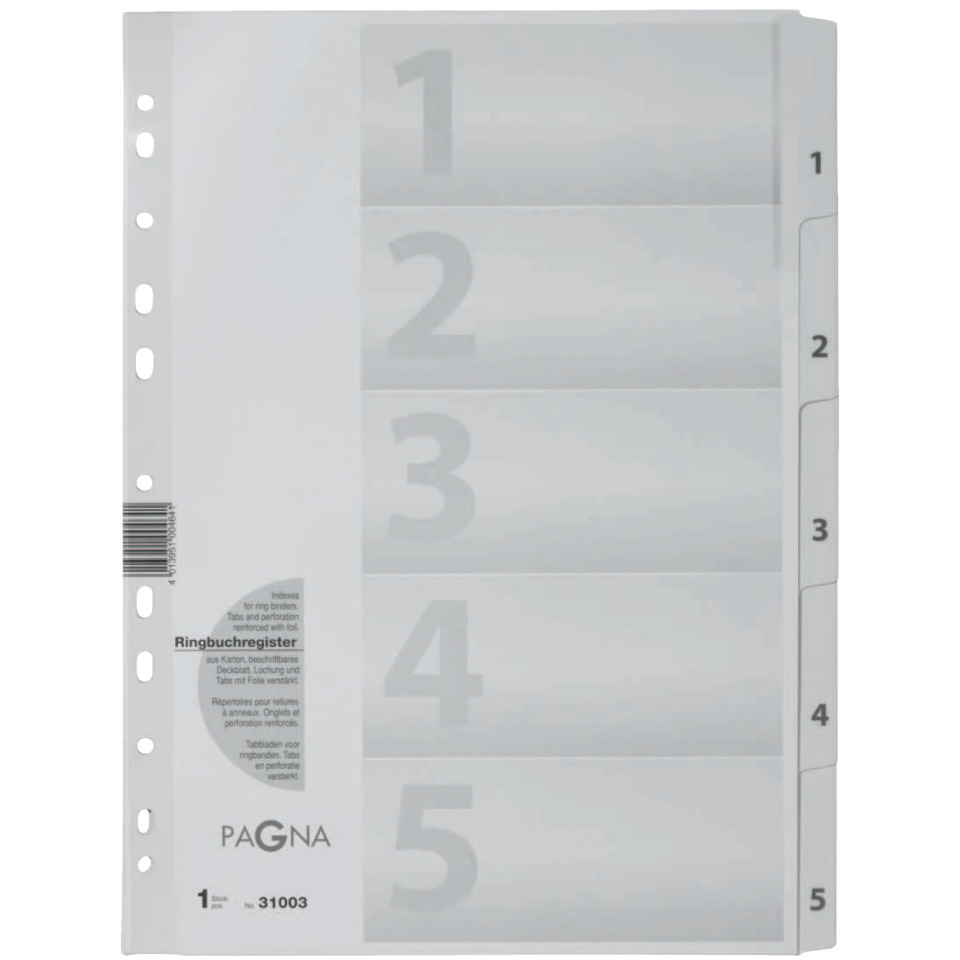 Register aus Karton, Taben beschriftet, Lochung und Taben mit Polyester-Folie verstärkt, Universallochung und beschriftbarem Deckblatt. Farbe: weiß. Größe: 225 x 297 mm (B x H).
