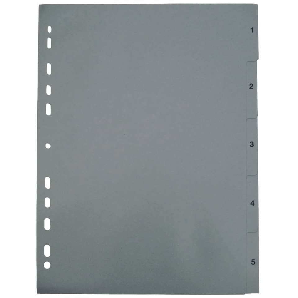 Aus Polypropylen (PP). Geprägte Tabe. Auch für Ringbücher geeignet. Mit Universallochung. Farbe: grau.